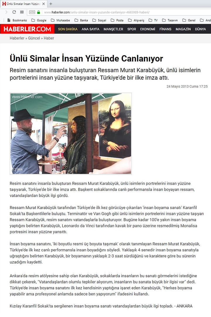 Resim sanatını insanla buluşturan Ressam Murat Karabüyük, ünlü isimlerin portrelerini insan yüzüne taşıyarak, Türkiye’de bir ilke imza attı. Başkent sokaklarında canlı performansla insan boyayan ressam, vatandaşlardan büyük ilgi gördü.
